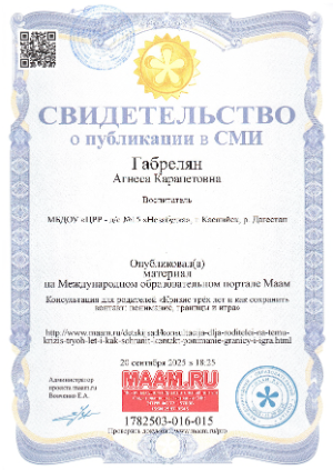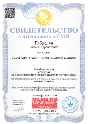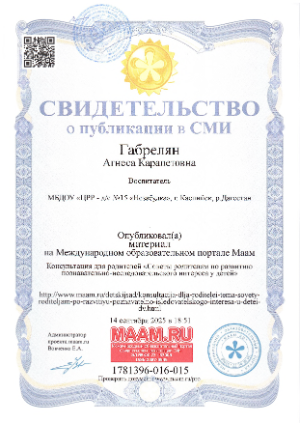 Прошла профессиональную переподготовку в «Межрегиональном центре профессиональных компетенций» с 14.01.2019г. по 07.04.2019г. по программе профессиональной переподготовки. Педагогическое образование :Теория и методика воспитания детей дошкольного возраста» г. Махачкала.