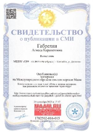 – Высшее педагогическое образование, закончила в 2007г. Ереванский Университет «Грачья Ачарян» г. Ереван, присуждена квалификация учителя начальных классов , по специальности «Педагогика и методика начального образования»